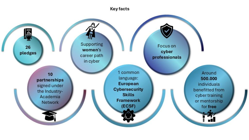 Welcome to the Cyber Skills Academy!The Cyber Skills Academy is an EU initiative aiming at addressing the growing cybersecurity skills and talent shortage in Europe. Why a Cyber Skills Academy? In an era of increasingly fast digitalisation, the shortage of qualified cybersecurity professionals is not anymore only an issue of human resources. For a company, a public administration, or an operator of critical infrastructure, having the necessary skilled workforce is about being able to ensure the protection and resilience of its systems against rising cyberattacks. Ultimately, it is about the security of the EU. “Cybersecurity is a top priority for the European Union, and bridging the skills gap is crucial to ensuring our digital economy remains secure and competitive."Henna Virkkunen, Executive Vice-President for Tech Sovereignty, Security and DemocracyIn 2024, there was an estimated shortage of 299,000 cybersecurity professionals in the European Union, representing a 9%-increase from 2023 – a gap that is likely to increase as most organisations will require more cybersecurity staff to comply with recent EU cybersecurity legislation such as the NIS2 Directive, the Cyber Resilience Act, or the Digital Operational Resilience Act. Despite the growing demand, 81% of companies surveyed in the 2024 Eurobarometer on cyber skills viewed difficulties in hiring cybersecurity staff as a key risk for potential cyberattacks. In addition, 76% of employees in cybersecurity-related roles do not have any formal qualifications or certified trainings. In the education, health, and social work sectors, 66% of cybersecurity roles are filled by employees transitioning from non-cybersecurity positions – highlighting the urgent need for reskilling and upskilling.This is why the European Commission presented in April 2023 a Communication on a Cybersecurity Skills Academy. The Cyber Skills Academy in a nutshellThe Cyber Skills Academy aims at bridging the cybersecurity skills and talent gap in Europe, by bringing together and improving the coordination of existing training, upskilling and reskilling initiatives for cybersecurity professionals. Four main areas of actionThe Cyber Skills Academy builds on the four following areas of action: Four areas of action Knowledge generation & trainings Fostering knowledge generation through education and training by establishing a common EU approach to cybersecurity training. Funding & projects Ensuring a better channelling and visibility over available funding opportunities and existing projects for skills-related activities to maximise their impact. Involving stakeholders and academia Calling on stakeholders and academia to make pledges, improve gender balance in cybersecurity and include specific measures to address the cybersecurity skills gap in national cybersecurity strategies. Measuring progress Developing a methodology to monitor the evolution of the market and measure the progress achieved towards closing the cybersecurity skills gap. PreviousNext (Last updated on 16/02/2026) 22 PledgersSupporting women's career path in cyberIndustry-Academia networkEuropean Cybersecurity Skills Framework (ECSF)Join the AcademyReady to be part of the solution? Join the Cyber Skills Academy today!Train, upskill or reskill yourself by registering to one of the trainings offered by the pledgers on the Academy.Become a pledger and commit to delivering cybersecurity training, reskilling or upskilling opportunities.Join the Industry-Academia Network to strengthen the EU’s cyber talent pipeline. What's new on cybersecurity skills 25 November 2025Europe mobilises cyber talent: New pledges and collaborations announced16 June 2025EU Cyber Talents: Launch of the Industry- Academia Network 21 November 2025Industry-Academia Network: Partnership highlight between ISC2 and CS VISOR Follow us on social media