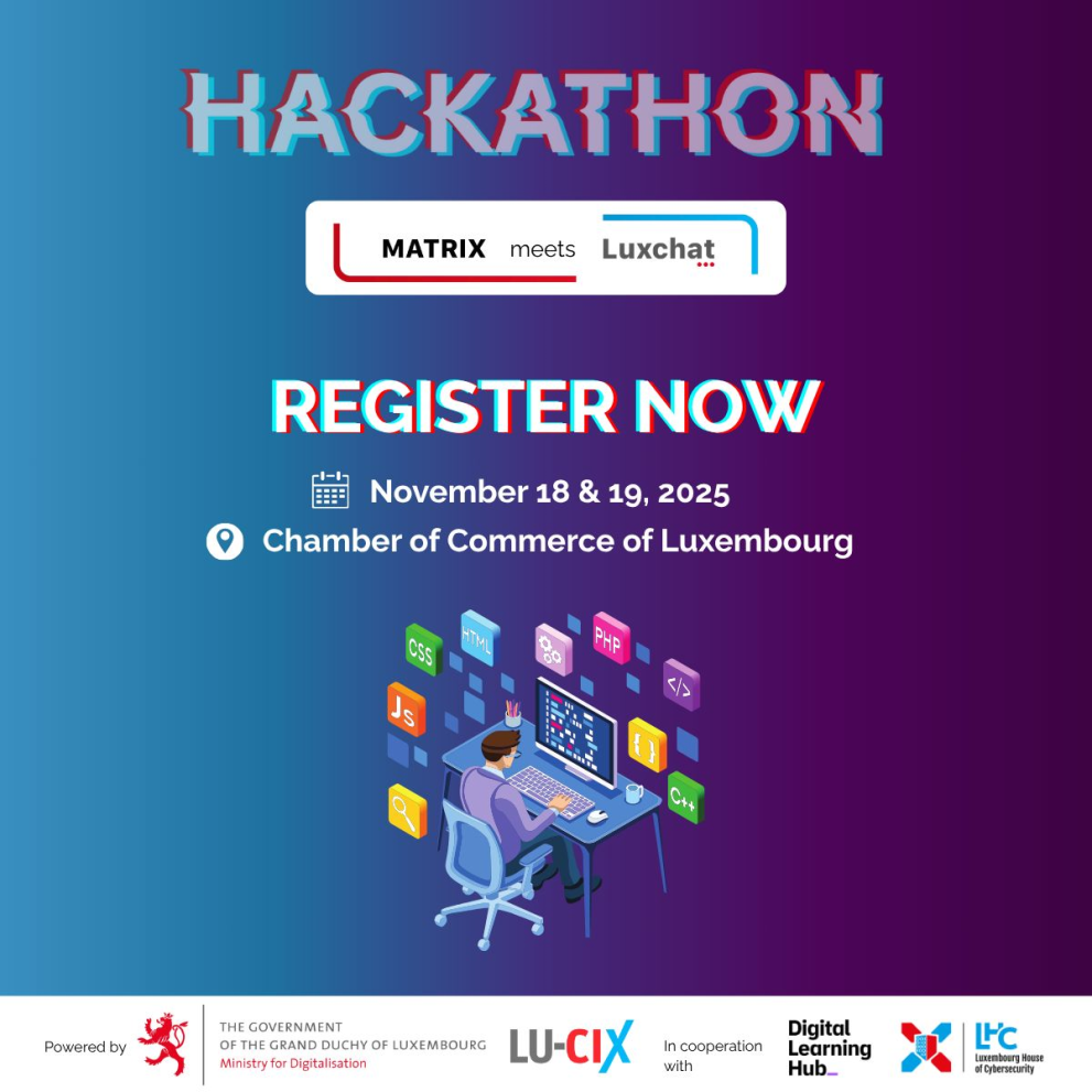 Nov17 « MATRIX meets Luxchat » – Hackathon Created byEmeline PETIT|Updated15 October 2025Event location 7 Rue Alcide de Gasperi, 1615 Kirchberg Luxembourg, Luxembourg 18 November 2025 12:00 AM GMT +0100 - 19 November 2025 12:00 AM GMT +0100Ce mois de novembre, le Luxembourg accueillera un événement dédié à l’innovation numérique : le Hackathon “Matrix meets Luxchat”, organisé dans le cadre des Luxembourg Internet Days 2025. C’est une occasion unique de créer, d’expérimenter et de repousser les limites de la messagerie instantanée et des interactions numériques tout en jouant un rôle clé dans l’avenir numérique du Luxembourg.Où et Quand?Dates : 18 et 19 novembre 2025Lieu : Chambre de Commerce (salle F01), LuxembourLe lancement aura lieu à 8h15 le 18 novembre, et les présentations finales se tiendront l’après-midi du 19 novembre.À noter : Le bâtiment de la Chambre de Commerce sera fermé pendant la nuit. Si votre équipe prévoit de programmer toute la nuit, pensez à organiser un espace de travail alternatif.Le DéfiVous rejoindrez 20 à 40 développeur·euses réparti·es en équipes pluridisciplinaires pour faire évoluer les plateformes de messagerie Luxchat (secteur public) et Luxchat4Pro (secteur privé), toutes deux basées sur le protocole Matrix.Pendant 30 heuresintensives (sans compter les pitchs), votre mission sera de concevoir des intégrations et améliorations utiles, créatives et innovantes. Quelques pistes possibles :Bots : chatbots IA, notifications externes, mini-jeux, etc.Extensions : accessibilité, thèmes, améliorations de l’interface utilisateurInfrastructure : meilleure gestion des ressources, analyses, déploiement automatiséServices aux citoyens : bots de service pour faciliter la communication entre entreprises et clientsIntégrations API : connecter Luxchat4Pro à d’autres systèmes informatiquesÀ la fin du hackathon, chaque équipe présentera un pitch de 10 minutes en anglais devant un jury composé d’experts de Matrix et de la tech luxembourgeoise.Qui peut participer ?Être âgé·e de 18 ans ou plusÉquipes de 1 à 5 membres (maximum 8 équipes au total)Les équipes pluridisciplinaires sont encouragées (développeur·euses, designers, profils business, etc.)Avoir un compte Luxchat (de préférence lié à un numéro luxembourgeois). Si vous n’en avez pas encore, suivez les instructions pour obtenir un LuxID et demander l’accès.Luxchat sera également la plateforme de communication principale pendant l’événement.Pourquoi participer ?Collaborer avec des pairs et des experts de Matrix.org, du secteur public et de l’industrie techConcourir pour des prix et une reconnaissance attribués par un jury prestigieuxFaire remarquer vos compétences auprès des leaders numériques du LuxembourgContribuer à un écosystème de communication ouvert et sécuriséPlus d’informations et inscription sur le site officiel des Luxembourg Internet Days 2025Event DetailsWebsite link“Matrix meets Luxchat” Hackathon powered by the Ministry for Digitalisation and LU-CIX ASBLTarget audienceCompétences numériques pour les professionnels des TIC et d’autres experts numériques.Compétences numériques dans l’éducation.Compétences numériques pour tousDigital technology / specialisationIntelligence artificielleDigital transformationDéveloppement d’applications mobilesLogicielsDigital skill levelAvancéExpert numériqueIntermédiaireGeographic scope - CountryLuxembourgShow lessIndustry - field of education and trainingInformation and Communication Technologies (ICTs) not further definedTarget languageAnglaisGeographical sphereInitiative nationaleOrganisation de l’événementSur la localisation Share this page Log in to comment
